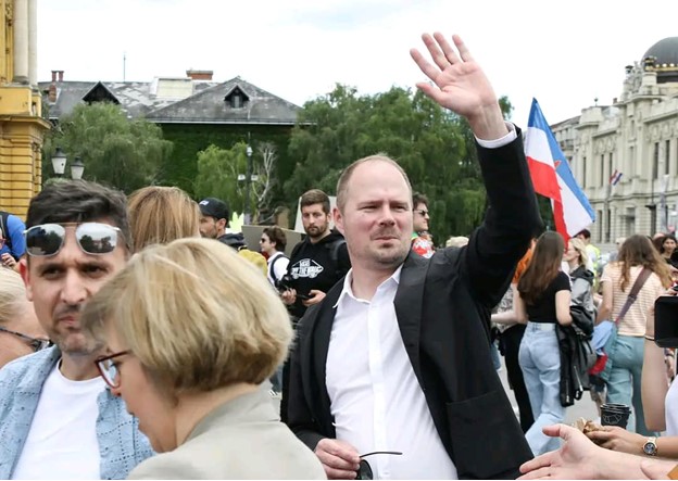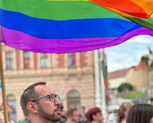 Luka Korlaet zamjenik gradonačelnika grada Zagreba ispred jugoslavenske zastave na Queer demonstraciji Zagreb Pride 2024.