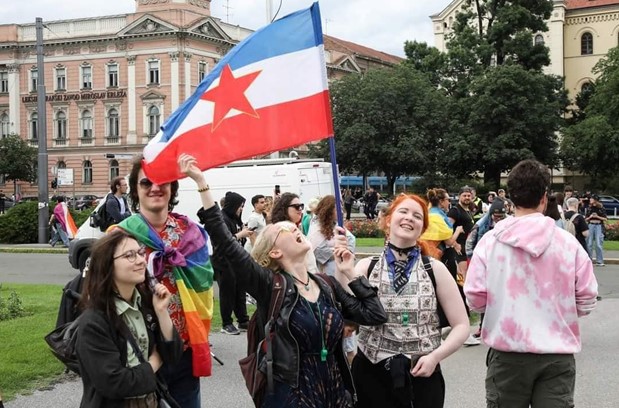 Ovo je fotografija Queer demonstracije pod nazivom Zagreb Pride 2024. Ona pokazuje demonstratore sa službenom zastavom Socijalističke federativne republike Jugoslavije i dokazuje da Queer pokret nije apolitičan. Ova zastava simbolizira propalu državu u kojoj su na vlasti bili komunisti (Savez komunista Jugoslavije), u kojoj je vladalo jednostranačje i jednoumlje, a sva ostala politička promišljanja bila zabranjena i kažnjiva.