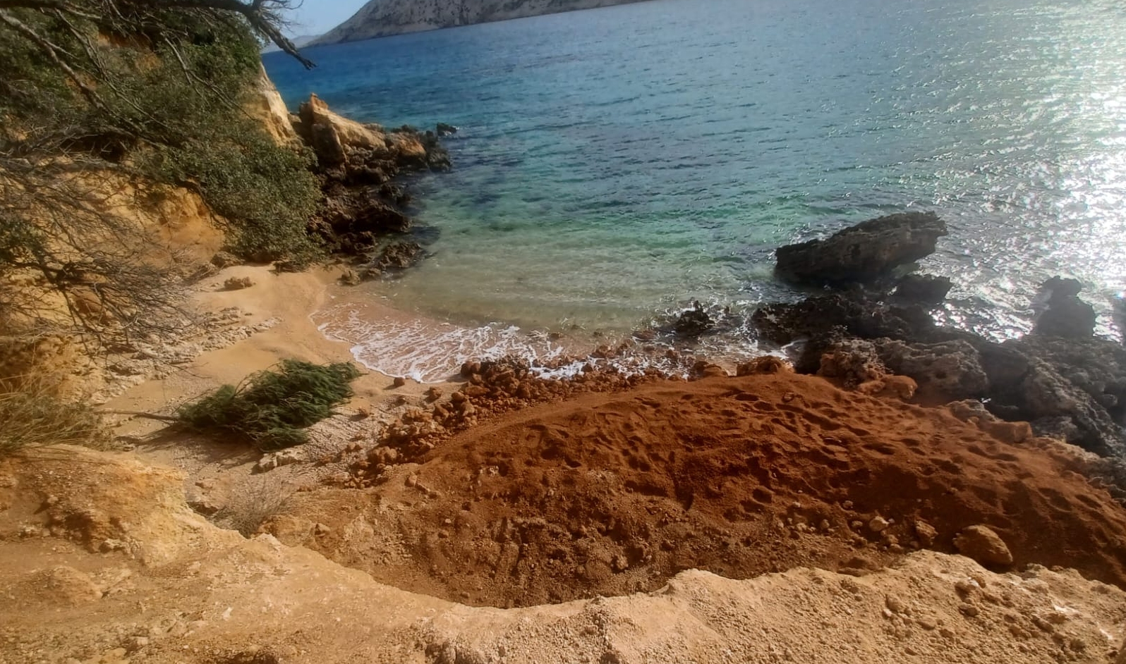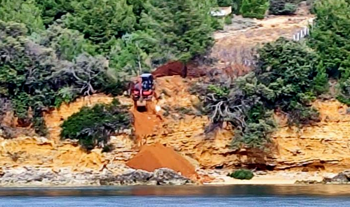 Ovih smo dana dobili prijavu lokalnih stanovnika da se na području Pudarice, na južnom nenaseljenom dijelu otoka netko odvažio bagerom prokopati put do jedne od skrivenih i s kopna nedostupnih plaža u podnožju 10 metarskog pješčanog klifa (slika 2) i time