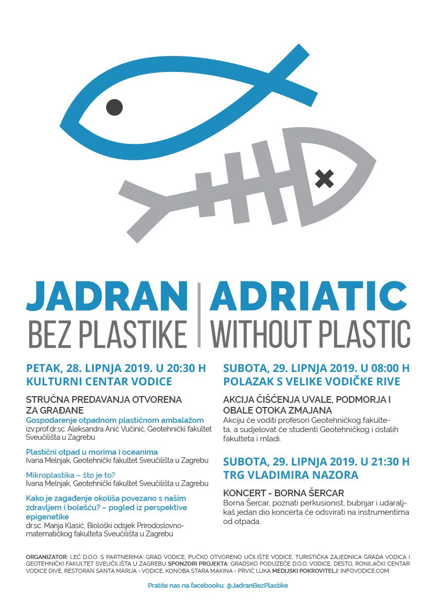 U petak 28. lipnja 2019. u 20.30 sati u Kulturnom centru Vodice, stručnim predavanima započinje provođenje projekta “Jadran bez plastike”. Riječ je je o projektu kojeg je pokrenulo lokalno komunalno društvo u sklopu svog višegodišnjeg programa Očuvaj okoliš. Jadran bez plastike je znanstveno—edukativan projekt namijenjen akademskoj zajednici i studentima koji bi, putem predavanja, rada na terenu i susreta s građanima, trebali osvijestiti ljude o posljedicama i negativnim učincima neodgovornog ponašanja prema okolišu na ljudsko zdravlje. Znanstven, jer sa stručnog i znanstvenog stajališta obrazlaže uzroke i posljedice negativnih utjecaja odbačene plastike u okoliš, a edukativan, jer svojim aktivnostima doprinosi osvještavanju građana i mijenja njihova ponašanja i odnos prema okolini. Cijeli je projekt, u prvom redu, usmjeren upravo na mlade akademske građane od kojih se očekuje da su aktivistički raspoloženi, otvoreni i da imaju razumijevanje za gorući ekološki problem, da su dovoljno odgovorni i ozbiljni da shvaćaju da daljnji odnos i ponašanje ljudi prema Zemlji, ovisi upravo o njima, njihovim daljnjim aktivnostima i stavovima. Problem odbačene plastike u moru je globalni problem koji nas sve više brine, o kojem se puno govori, a različitim aktivnostima problem se nastoji smanjiti i onemogućiti daljnje zagađivanje mora i okoliša.
